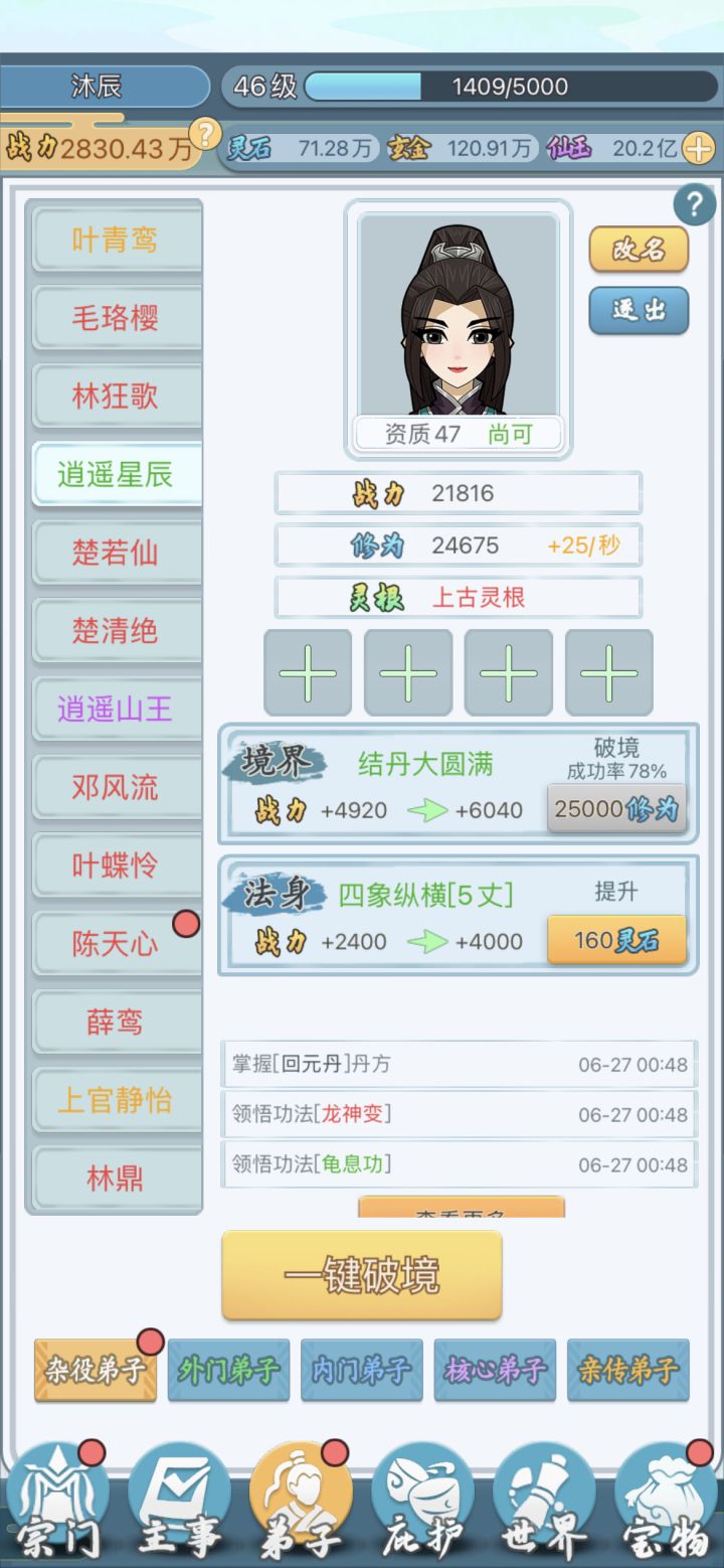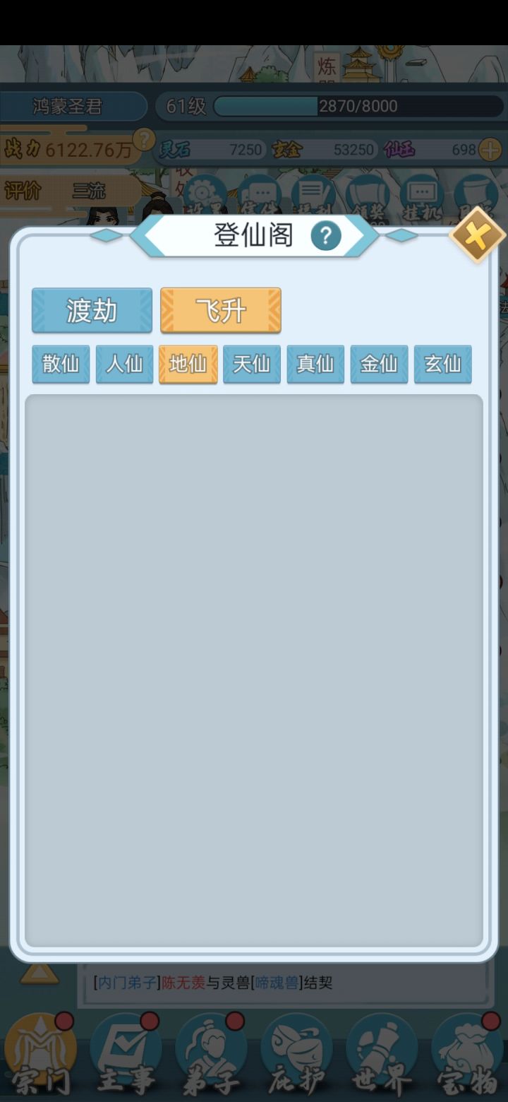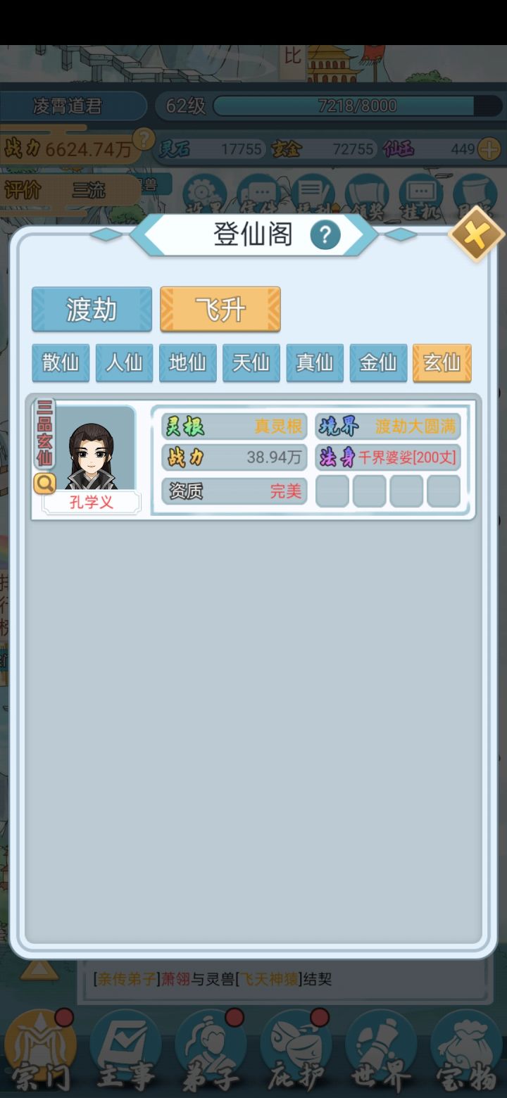 这个游戏广告有些多,能忍耐下去的请往下看吧。1.召弟子:弟子灵根优劣和门派的级别有关,刚一开始只能招单灵根双灵根的,级别上去了才能招到好的, 天赋红色的就行,天纵天选完美感觉没什么不同。弟子天赋其实没那么重要,+12的和+30的差不多少到最后都能升满,甚至升满了却由于技能/炼丹没学完最后还得等她们学完。可以看到混沌还不如双灵根战力高,因为前者熬的时间太短,技能都没学全2.仙玉有限用在哪里?