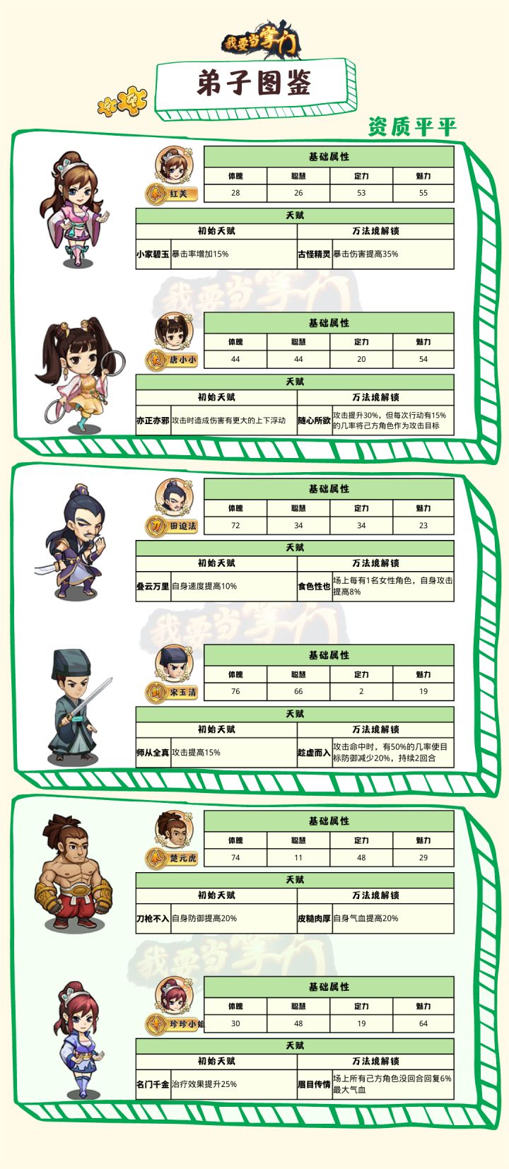 为了让新掌门了解咱们门派的弟子小师妹双手奉上弟子图鉴快来眼熟眼熟~纵使资质平庸,仍有出头之日哦~