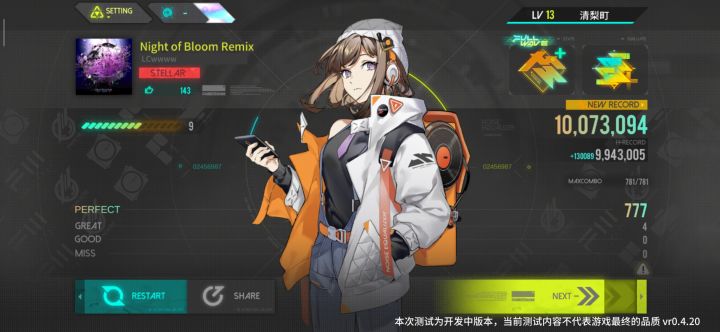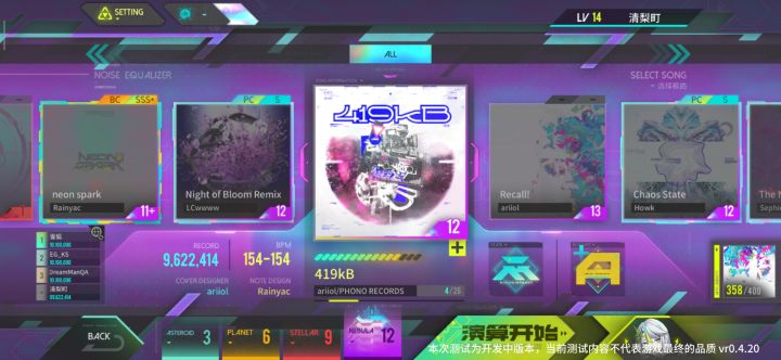 此文此文不适合强洗玩家看,指出一些观点1,断触频率太大了,有时候不知道为什么就会断触,见图1,2,在判定区域内都会判离手mⅰss,而且有时摁到了也会判定小姐。2,暂停按键没有双击,有次我摁到了就不小心退出去了,改一下。3,人物有点感觉太潦草了(图三),我最初以为还是个机娘,而且游戏有点缝(音击+ARC+PJSK),不过原创挺不错的,开头测试剧情也挺有意思如果如果按十分打分的