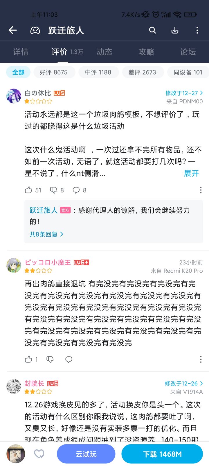 某些三星角度强度太拉垮了,最近300抽了个跃一朵莉,拉满后才发现站不住也没输出。大也开不出来就死了接近30万的血。其实也不止她,很多刺客都是一个样,如果花重金抽了这些角色的基本就是太失望退坑了。强度太不平衡了。我存了1个月的票一下子就退坑了,可惜了。
