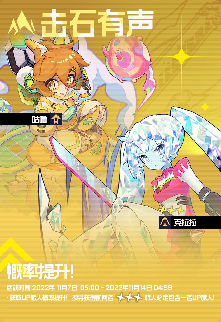 【UP卡池预告】“击石有声”限时开放——咕噜、克拉拉出现概率UP!卡池时间:2022年11月7日5:00—11月14日4:59▼相关通道▼跃迁旅人公众号:跃迁旅人手游官方工作室公众号:元游社微博:跃迁旅人手游游戏官网:iOS下载:代理人们也可以加入官方QQ群,持续关注我们哦~《跃迁旅人》官方粉丝3群:627264450