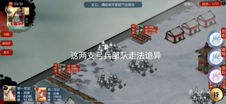 为什么只是建议呢,因为这关实在变T,运气成分仍然很大。第一:两支军团队伍都必须刷出强行军。从第一回合就要用强行军出击,别省。第二:第一军团往右走三格;第二军团往上左方向走三格。这步大家都会走,难点在后面。第三:最终两支军团要靠近在左侧兵营前,因为最左侧两支弓兵部队最讨厌,走法极其诡异,极容易错过,可能有一支军团需要耽误两回合去消灭这两支弓兵部队。第四:两支军团从左侧兵营前,两路分别往右进攻