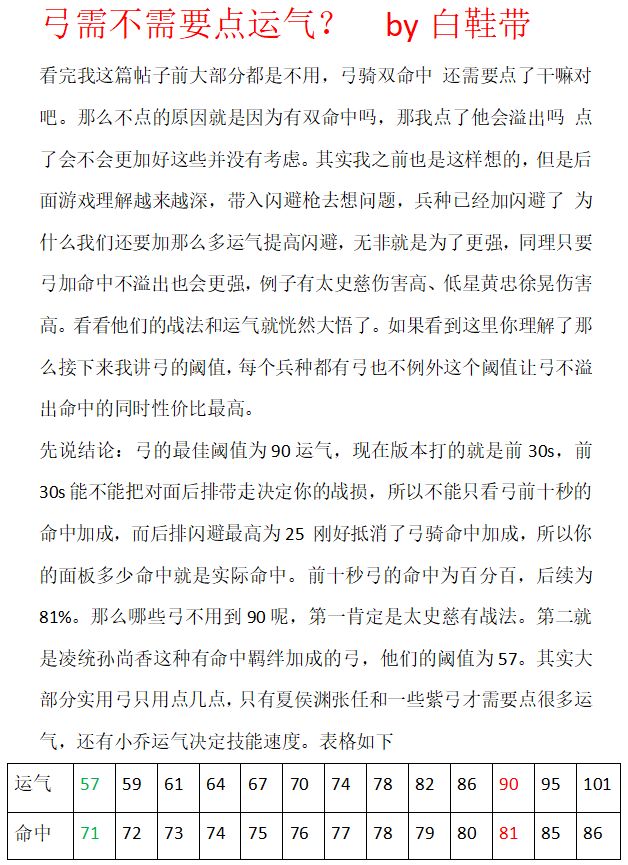 看完我这篇帖子前大部分都是不用,弓骑双命中 还需要点了干嘛对吧。那么不点的原因就是因为有双命中吗,那我点了他会溢出吗 点了会不会更加好这些并没有考虑。其实我之前也是这样想的,但是后面游戏理解越来越深,带入闪避枪去想问题,兵种已经加闪避了 为什么我们还要加那么多运气提高闪避,无非就是为了更强,同理只要弓加命中不溢出也会更强,例子有太史慈伤害高、低星黄忠徐晃伤害高。看看他们的战法和运气就恍然大悟了。如