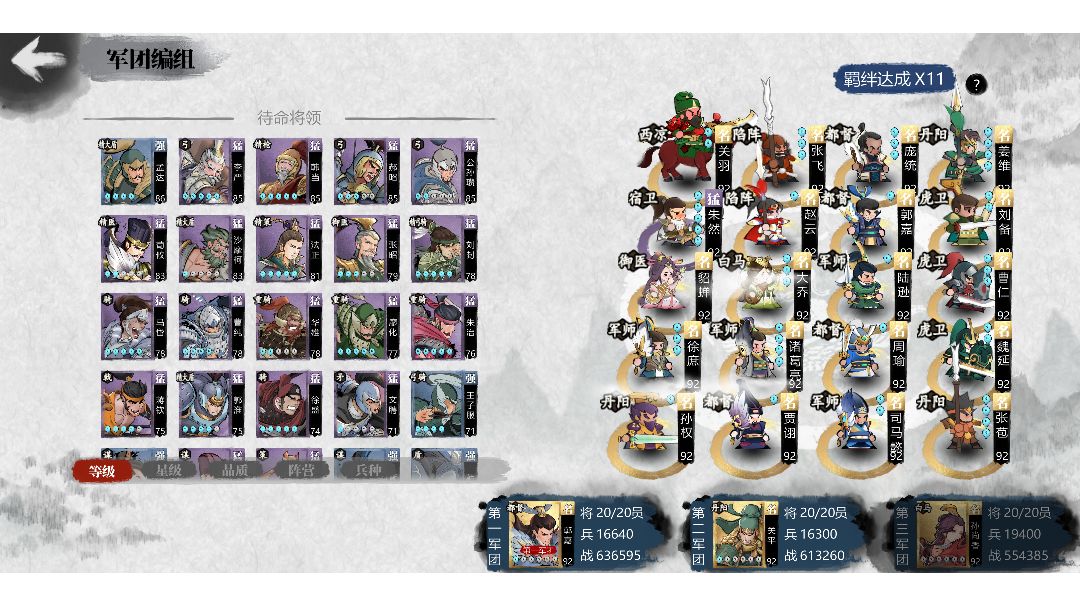 不用貂蝉只能用高等级去打,有点麻烦,这里还是需要弓来做主输出,前排的话闪避枪只有运气比较高的可以用,没有貂蝉其实也非常能抗,但是吧这个打法就是需要你去肝等级(u1s1,最后那几城的小关比大关难,我不知道是怎么回事😂)