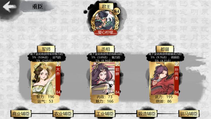 现在真的就是一代版本一代神呢,目前大部分武将命中比较低,所以推荐都加一些运气,毕竟只有打到别人了才能回复怒气呢,里面发每个橙将的细微攻略
