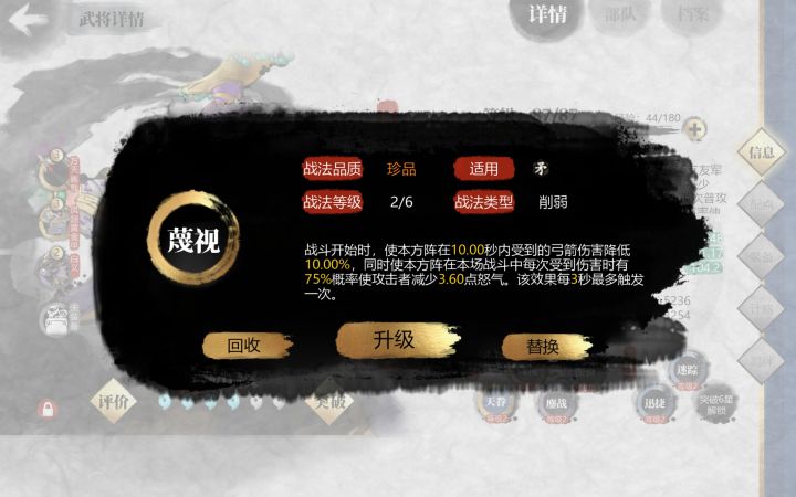 A.盾系a.大盾兵进化。虎卫获得治疗减伤,车下攻击始对方混乱,白牦伤害增加。b.甲士兵进化。藤甲获得50%物防减少50%策防,飞熊获得治疗加伤害,先登纯伤害。总结,1.虎卫和飞熊适合阵中有大量医师时候用,虎卫纯抗伤害,飞熊给武将攻击技能很强的前排用。(虎卫站中间,飞熊站边路)。2.车下控制一般配合(郭嘉)用来对位对面输出很高的前排,藤甲用于对面大量弓箭是针对用(有攻击策士死得飞快),白牦完全