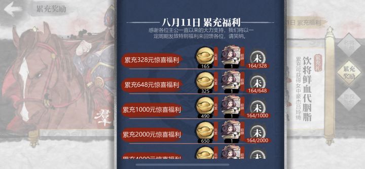 这游戏千万别充钱尤其是冲1万以下的,天天被0冲吊打。你就算把一次最少给40伏虎相当于人民币280,当然如果你要像我一样开始发展错误投资骑兵那就更是血亏。按在地理摩花了一个月工资充值极其后悔,送的吕布吕玲绮有用么你怎么不送香香,忘各位小r悬崖勒马。0冲才是王道,问开局号的,香香貂蝉 加几个金枪就能玩,什么盾兵后期脆的要命,打敌人3队死光光。国家队的也没啥用。主要还是闪枪加弓骑加高星法师。人家一般都是
