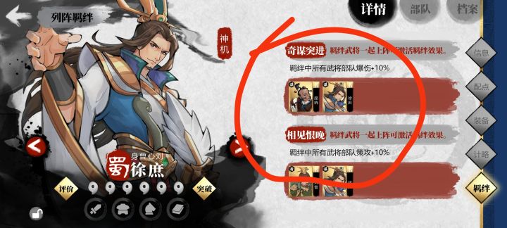 羁绊阵容 激活 大家看羁绊就很好理解了 画红圈的就是 我8个武将触发一大堆羁绊