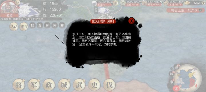 游戏维护好了就增加点游戏性吧,现在60万战48级。想再推城,电脑跟我的等级差有七级,战力差距接近20万,每天只能干看着游戏界面,看我的五虎将很无聊啊。竞技又打不过,奖励也不多,特别是演武令每日任务给的太少了,打两下就没了。以前的流寇还有30个,现在就10个,我每天上线刷个日常就只能下线。