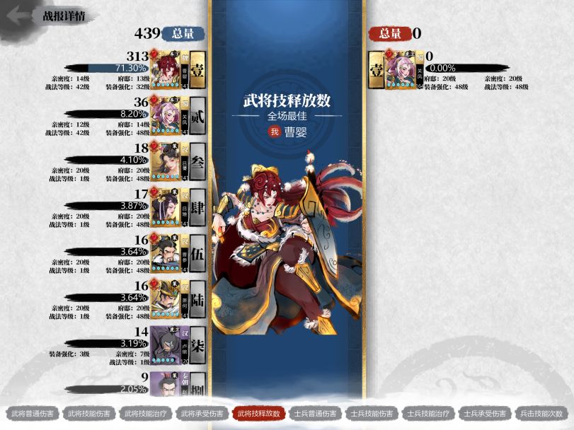 如图所示,曹婴在240秒的对局中释放了313个技能,平均每秒钟获得130怒气。通过观察怒气条发现,曹婴释放武将技前一切正常;第一次释放武将技后,怒气恢复异常,怒气条转的比陀螺还快。疑似武将技存在BUG,BUG原因不明。