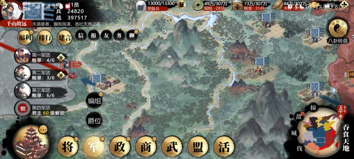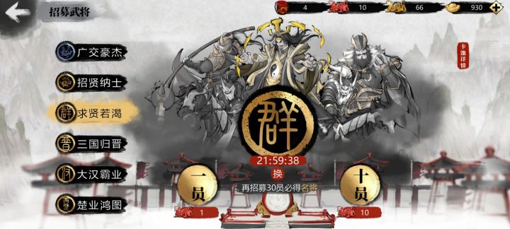 两个大问题,一是今天一登录讨伐的营寨都不见了,可掠夺的敌人也没了。二是,抽卡界面求贤若渴不把红色兵符用完不能使用元宝抽卡。我想攒红色兵符却没办法,,建议提供元宝和兵符抽卡的选项。另外还有一些体验上的小问题,进入主城后好像没法直接退出,要先点右下角地图然后三国志才能返回,略有一点麻烦。…………………分割线…………………………补充一下,过了一会重新登录后就有一些营寨刷新出来了,不知道是运行问题还是设定上营寨是一点一点慢慢刷新的。