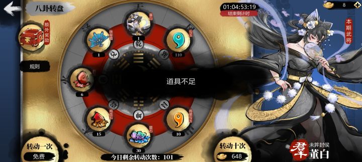 标着免费转动一次,结果跟我说道具不足?啥意思,合着不是免费还是要元宝呗?骗氪成这样了?