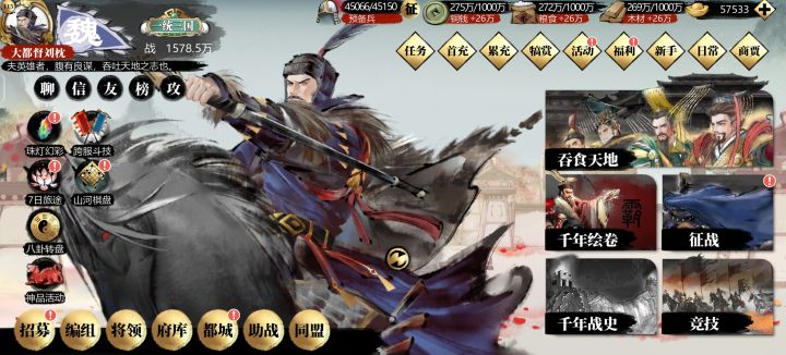 玩了几个月,1500万战力吞食天地卷土来袭,才打了八关,人机史诗级加强。我都不知道怎么打。千年绘图,三国剧本全打了之后就过了楚汉争霸和晋朝与孔子周游记,又玩了会儿其他剧本,捡了点元宝,一直不知道下一步想打啥,其他的剧本也看不咋懂,现在每天只混个所有任务,做完下线了,就很难受