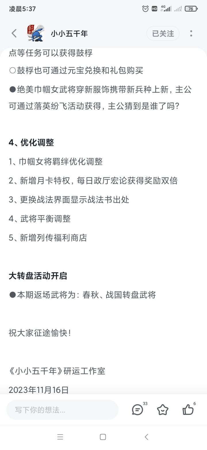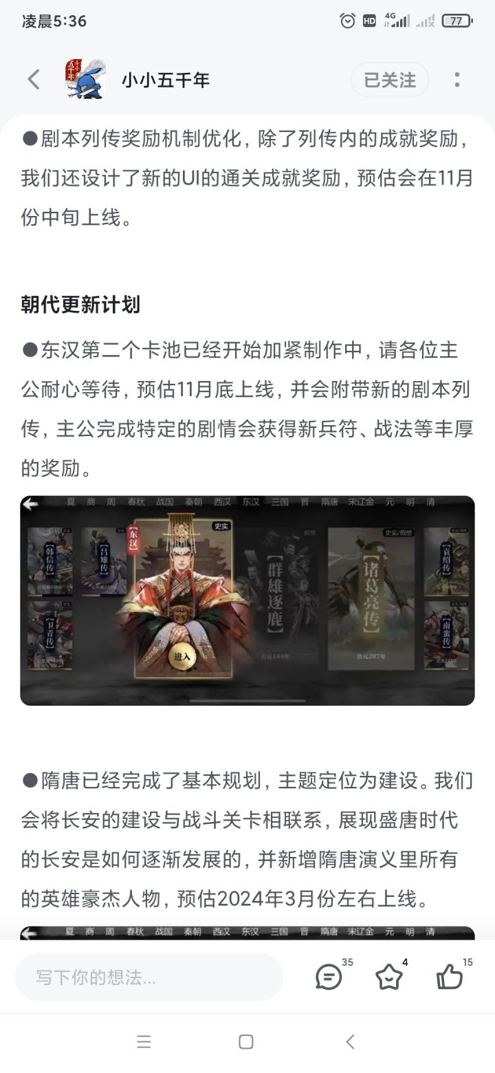 11月中旬该出的列传福利上次更新预告就提到了,结果更新出来根本没有。在这里给你们一个提醒,别忘了!还有已经制作了几个月的东汉下,别鸽!!!看下东汉上什么时候出的,今年的朝代更新跟去年比慢了一倍!!!红符都在仓库吃灰。趁现在玩家还有热情,不要一直消磨大家耐心,哪怕你做个半成品出来都可以,该复制粘贴复制粘贴,该ai就ai。我们下限已经很低了!!!还有的汉末武将!千年模式不开这玩意就死在那里了吗!不能换