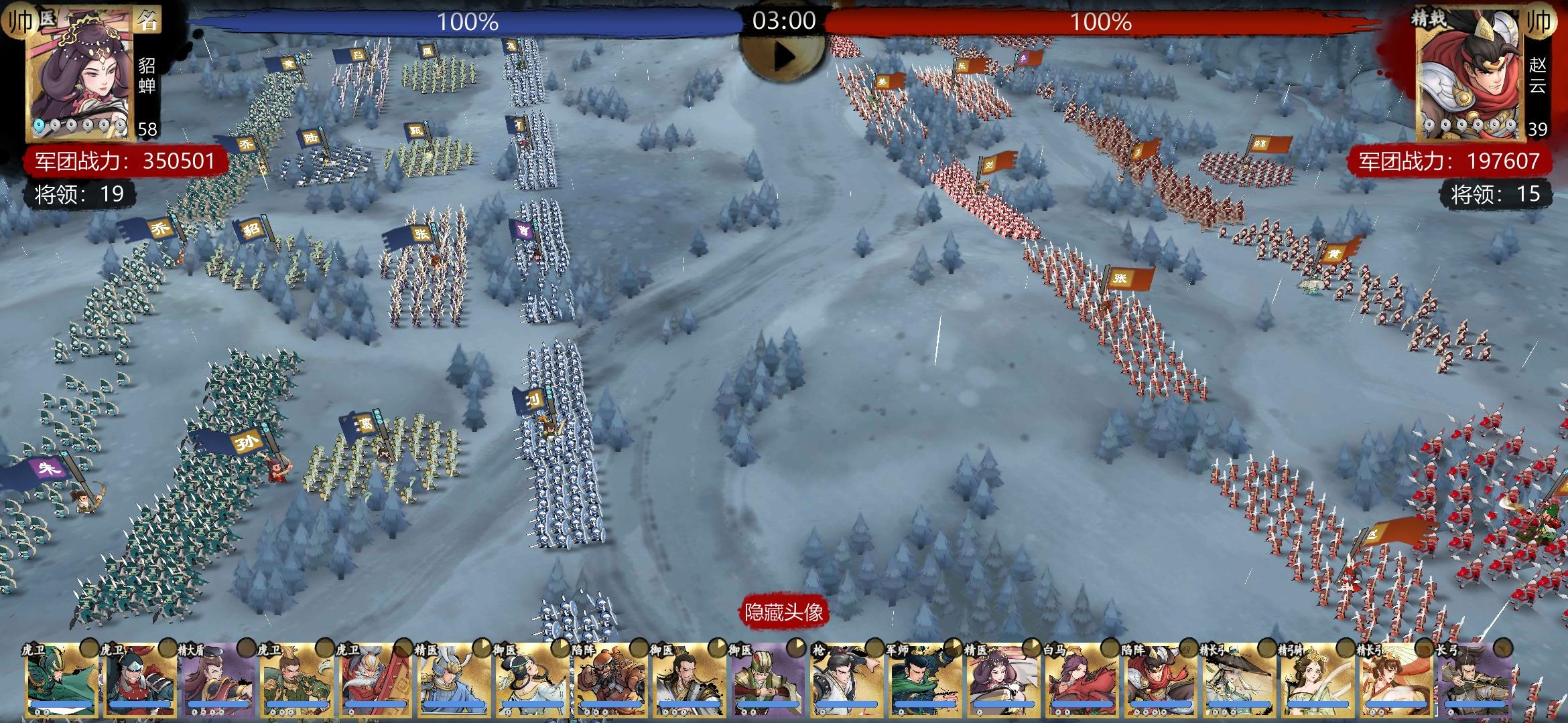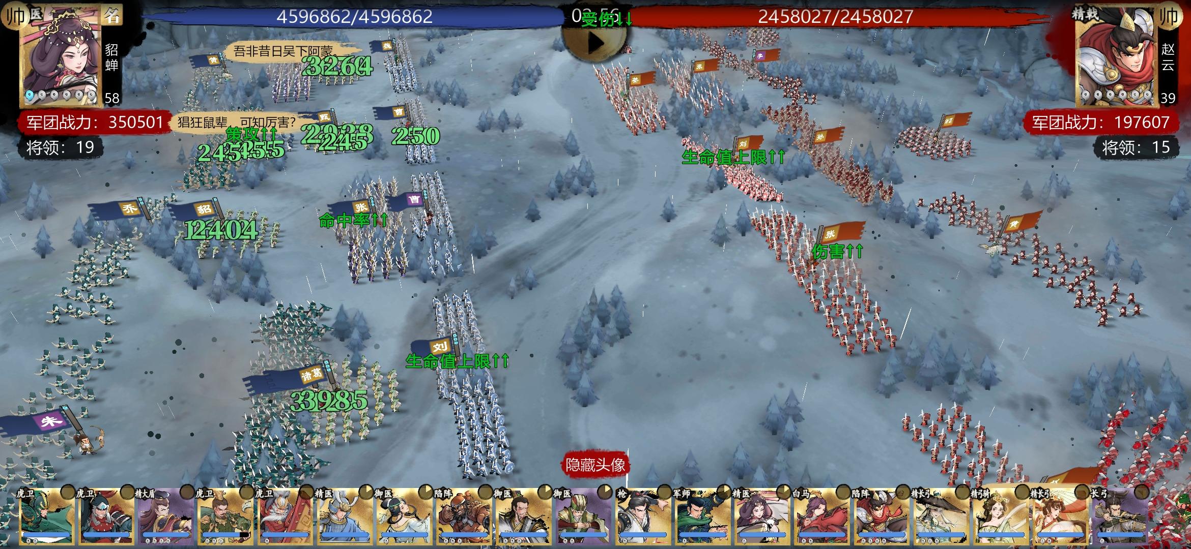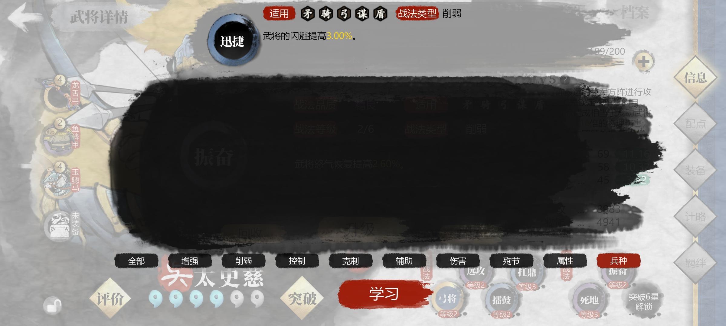 新的战法如图,玩的久的一看就知道这是用来针对陶谦的了。于是我买了一本进行了测试。在30s之前,双方势均力敌这是30s之后,由于敌方陶谦没有出战法技,我方直接进行了碾压。总结:之前pvp没陶谦不行,现在没陶谦也不行,但必须再带上“鸦雀无声”,你的陶谦没了战法,我的陶谦也没了战法,我们等于都没了陶谦。为什么你游的游戏平衡出了问题,现在要玩家自己花费1500元宝去修正他?提议与建议:1,弥补玩家