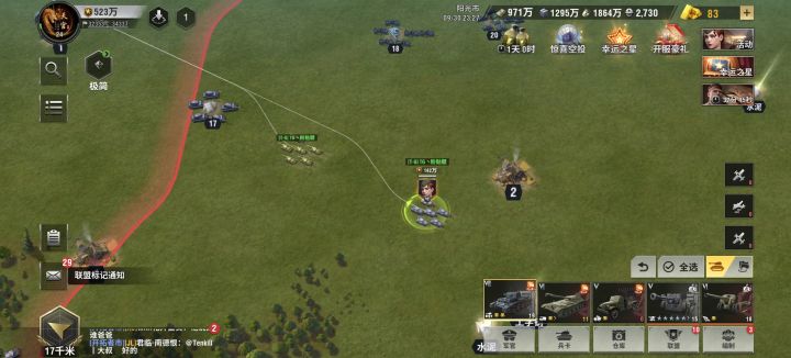 1.带着集团军时候我出去一下,时间也不长,然后集团军就卡死了,一直在组建集团军页面,但是联盟中有集团军,我点一下坦克再点集团军也能控制打架,也不知道怎么解散的,然后回基地了还是显示在集团军,同一个兵卡每操作一下都需要退出集团军一下,后来干脆在基地里面出不来了。2.还有今天有个挑幸的拿飞机炸我,我立马集团军过去推了,他又在频道里骂我,我也不知道为啥没有他飞机炸我的战报,希望能在战报中体现最先进攻者