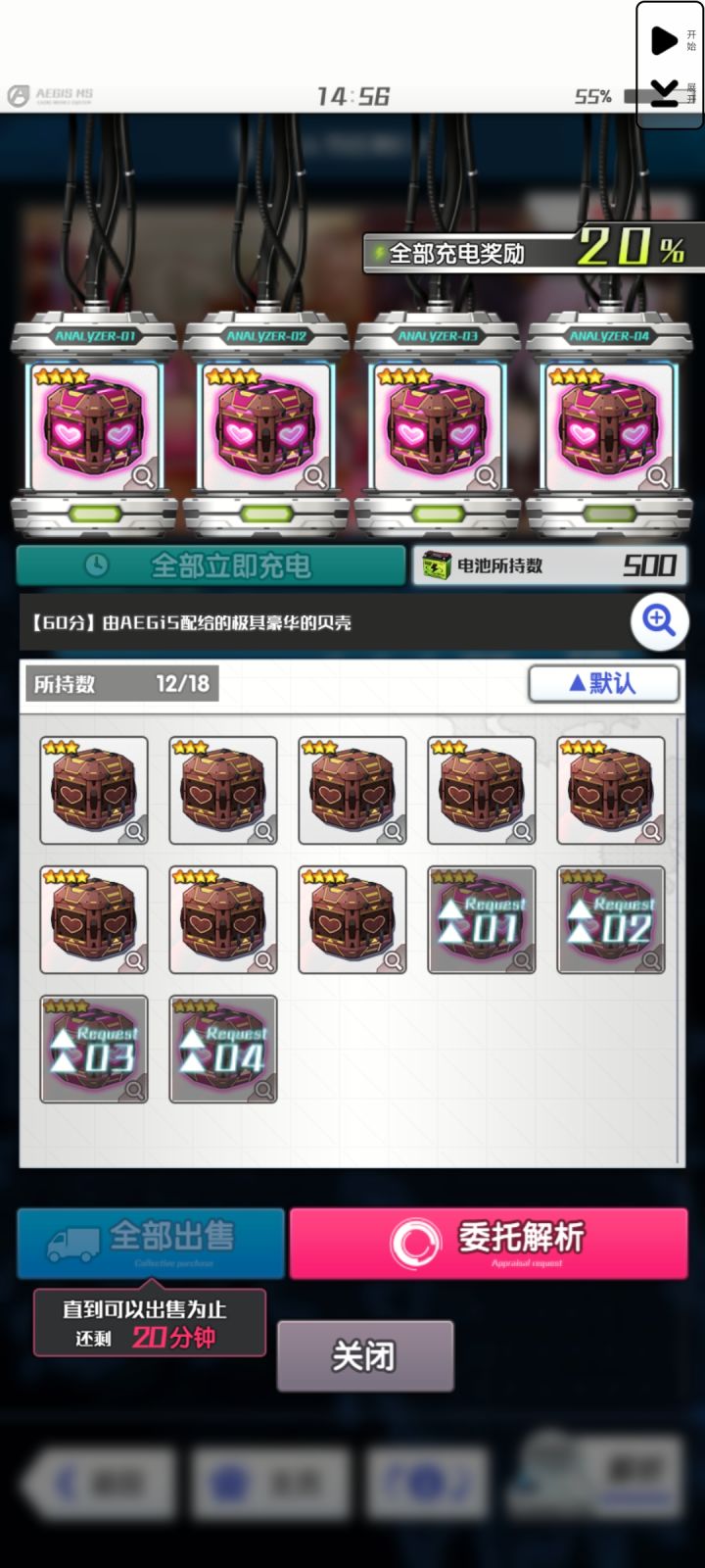 给纯萌新一点小小的建议:基于50级本随便过的基础来给出建议。1.箱子只解析四星,尤其是四星还带粉红色桃心的,如图中最后一个箱子。2.三星及以下全可以卖掉。在刷满仓库以后把四星的都解析,其余点全卖,每30分钟可卖一次。如剩余位置够多,可以再刷,满了刚好够一波,则可以电池加速上一波,将新的四星解析,而后卖出。3.电池再多,也坚持解析四星。后面的兔女郎等一些活动,模式与情人节相同,电池会决定你毕业