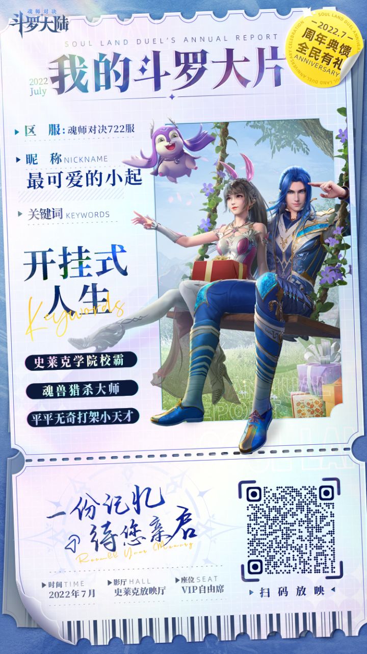 周年典馈,全民有礼一份记忆,待您亲启时间:2022年7月影厅:史莱克放映厅座位:VIP自由席小起在此邀请各位魂师一同观赏属于你的斗罗大片领周年好礼,分享你的斗罗大片还有机会赢取Switch、iPhone 13 ProMax等好礼喔~新故事的篇章即将开启未来一起前行吧!小起还会在7月15日揪5名评论回复的幸运魂师送出【50元游戏礼包】一份~以下为本期活动中奖名单,请中奖的魂师