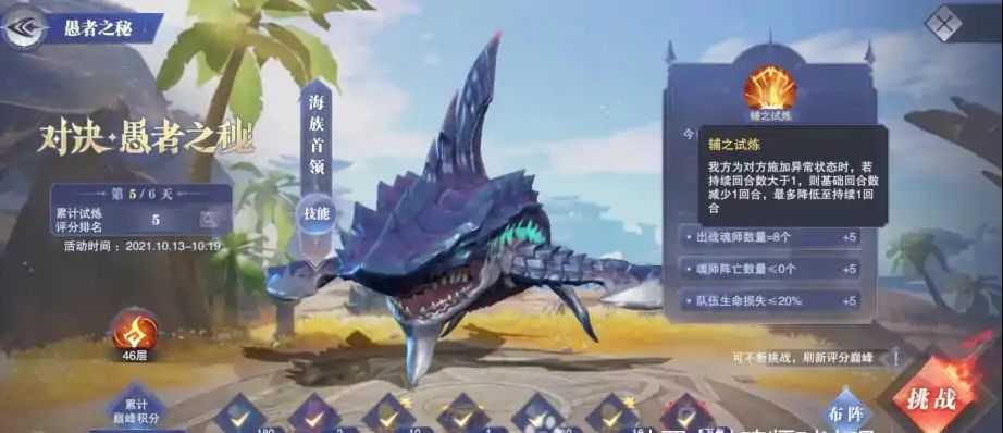 一、前言玩法较前四天有所不同,变成了波次怪,一共五波,每波都有一只邪光鲨,从它的被动可以看到,每波开始前它都会自动释放一次大招,不过伤害较低,不必担心。并且boss的血量较少,也没用免疫控制或者反伤的被动,打起来轻轻松松。 二、阵容以及魂环搭配朱竹清2212刚刃 加点全爆伤戴沐白1112武胄 加点全攻击宁风致1121鹿鸣 加点全攻击鬼魅1221璃光 加点全速度火舞2111言灵 加点全