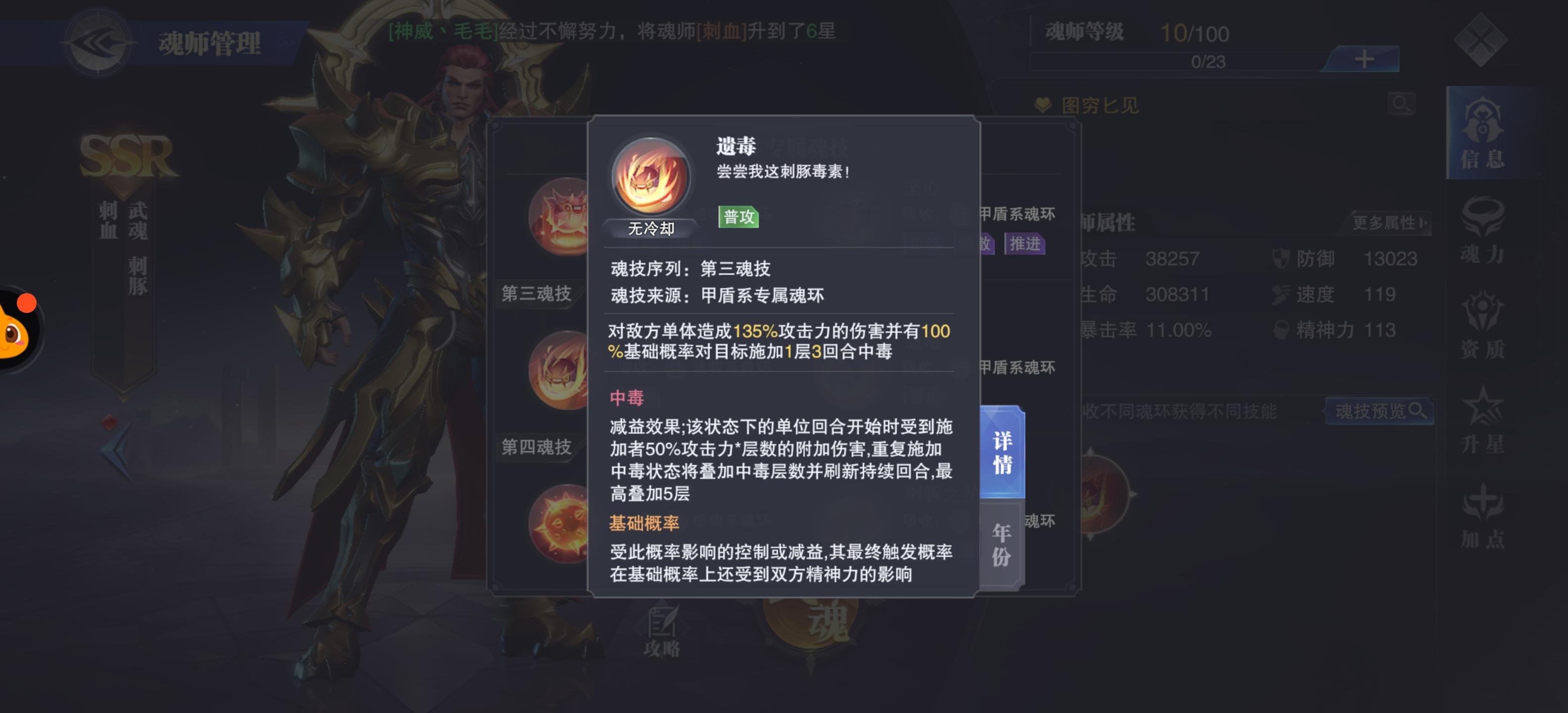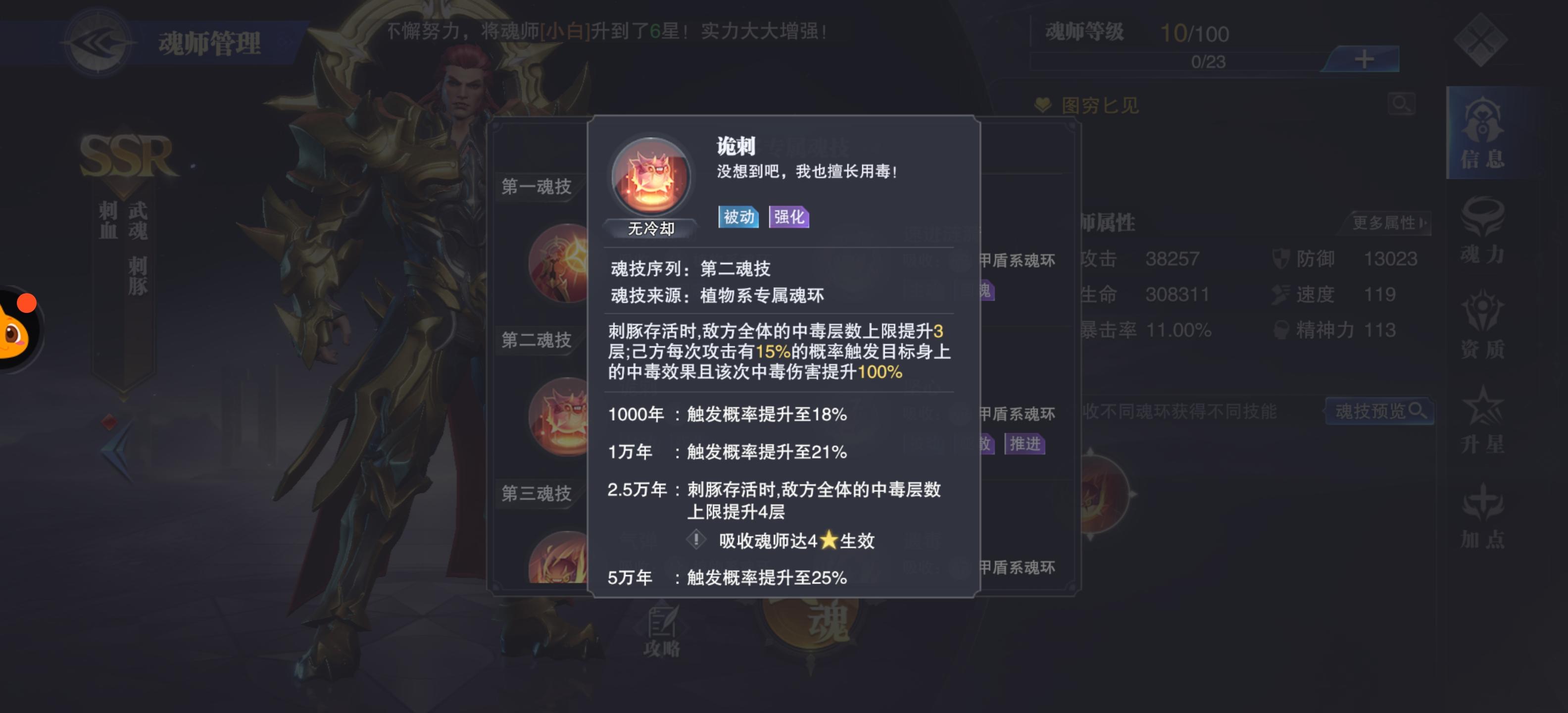植物系第二魂技:存活时,中毒上限提升3层,己方有15%的几率触发中毒效果且中毒伤害提升100%
