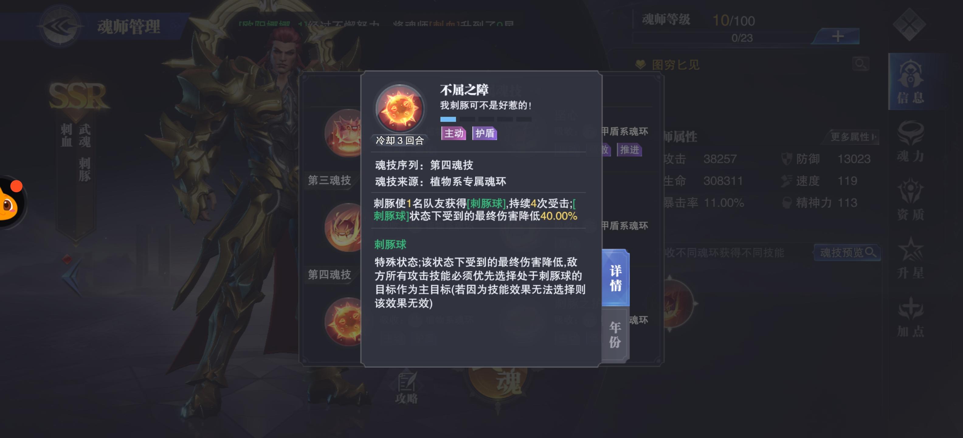 植物系第四魂技:使一名队友获得“刺豚球” “刺豚球”:持续4次受击,受到的最终伤害降低40%,此队友为对方优先目标(嘲讽进阶版)