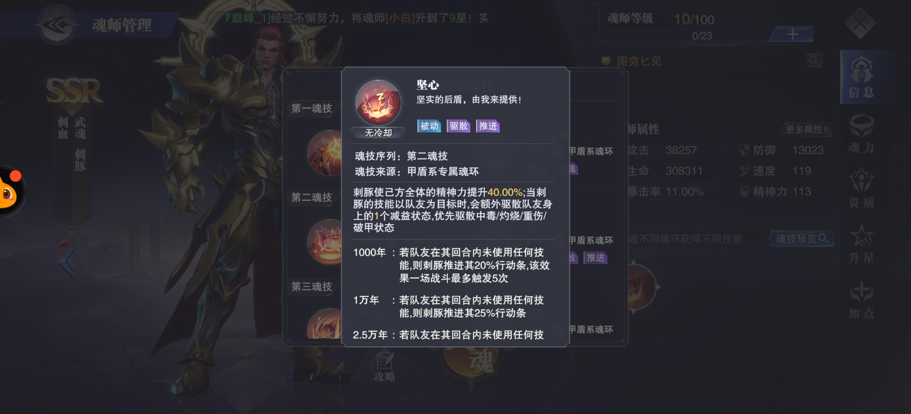 甲盾系第二魂技:全体精神力提升40%,驱散目标队友的一个减益状态