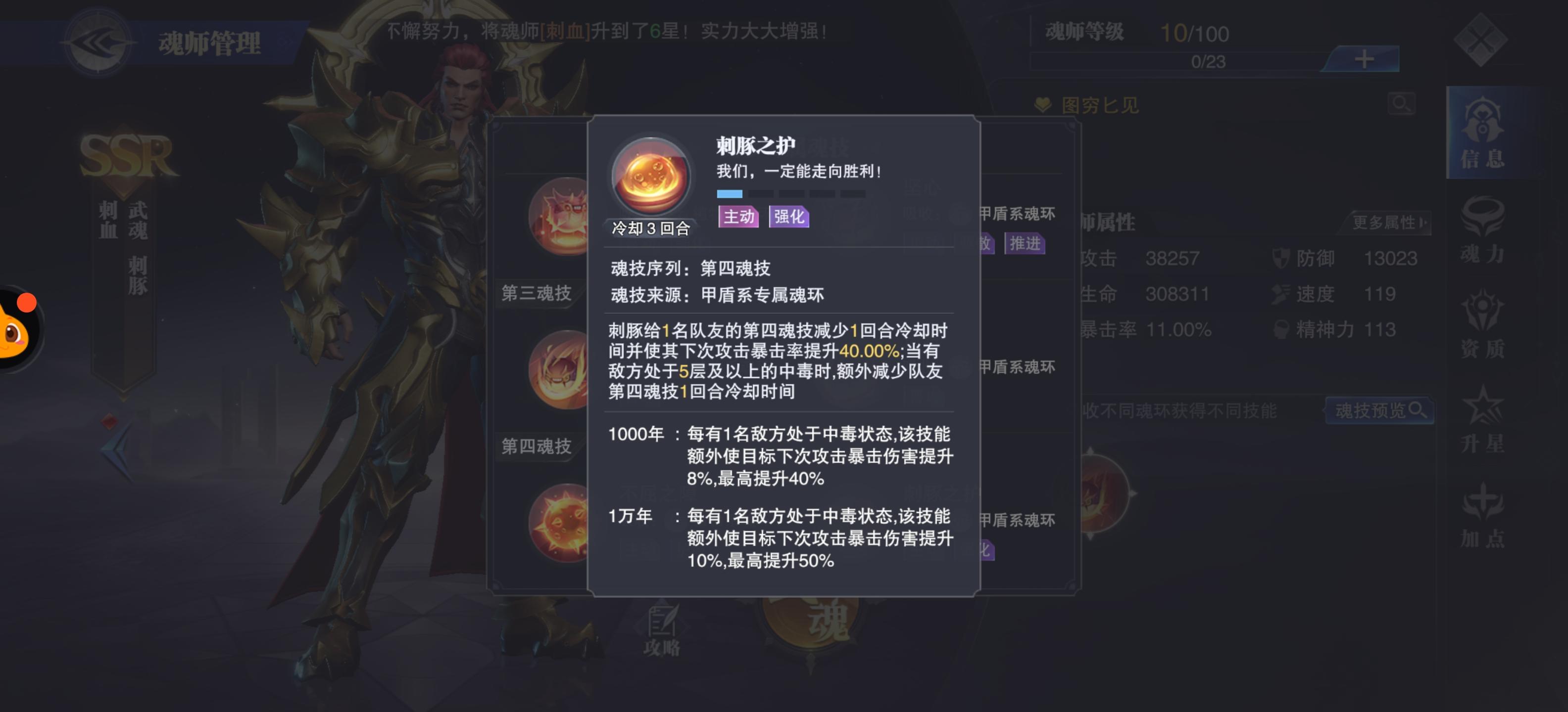 甲盾系第四魂技:减少一名队友第四魂技1回合冷却,下次暴击率提升40%,有敌方处于5层中毒以上,额外减少队友第四魂技1回合冷却
