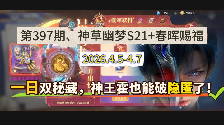 大家好,我是正在看直播的何二维一。今天晚上SP+神王霍雨浩就要正式上线了,而刚刚官方也是进行了SP+霍雨浩技能的直播,所以接下来的攻略咱们就来把此次直播的关键内容做个汇总分析,希望能给大家一些小小的帮助和欢乐。这里先把此次直播的通码给汇总一下:(截止维一写完这篇攻略为止,这些兑换码截止4月3日晚上20点便会过期......)神王临世万魂臣服为爱成神一念永恒上图为官方对SP+霍雨浩的背景说明,