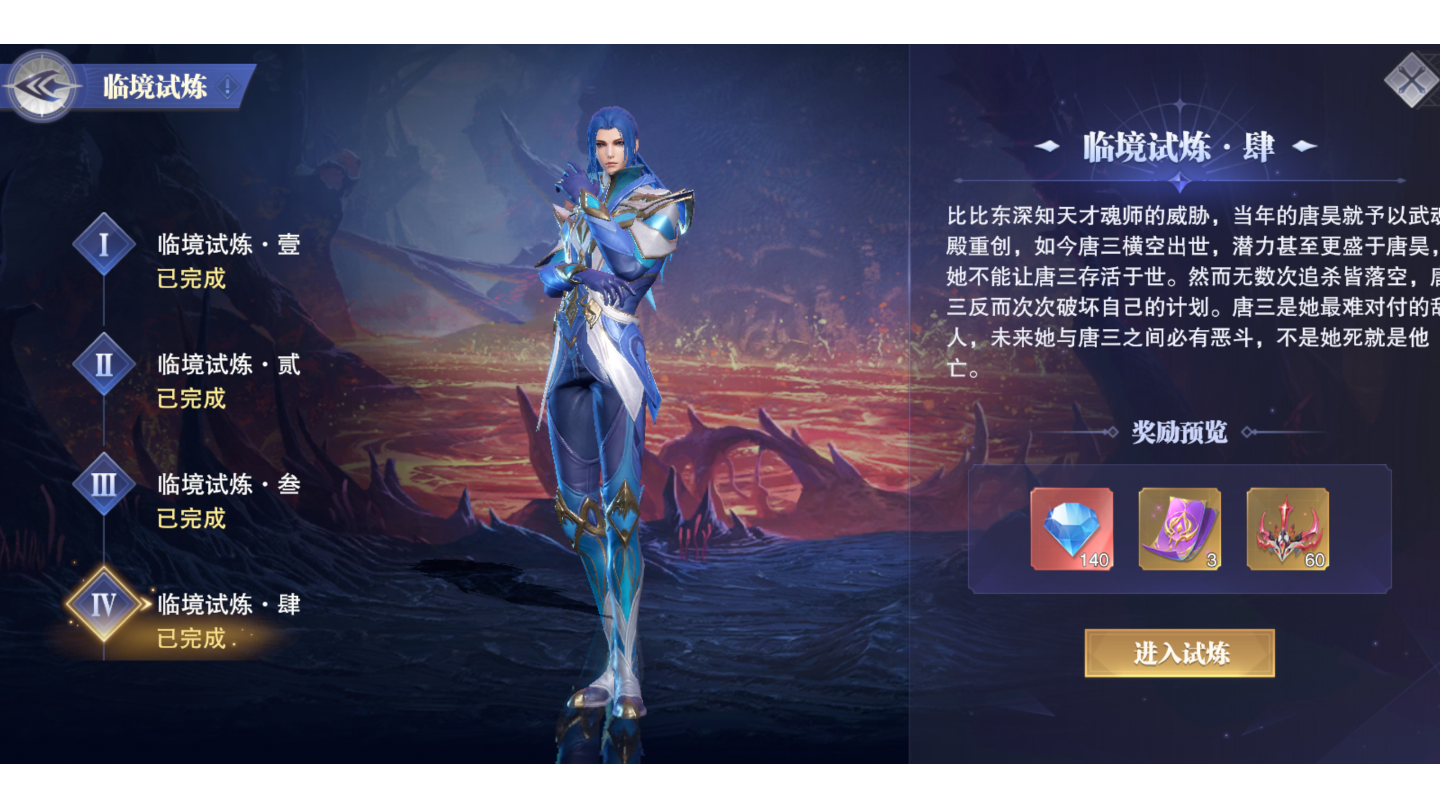 临境试炼第四天第二关通关攻略说一下要点, 第一,开局无敌要在宁荣荣身上,不然重开 第二,比比东一技能打唐三,唐三和小五会被打残,如果唐三或小五任意一个回满血从开 第三,因为比比东是群伤所以无敌会转移到唐三或小五身上,胡烈那普攻有无敌的那个,如果无敌没有回到荣荣身上,重开,如果小五或唐三回满血了,重开 第四,无敌在荣荣身上时候的时候,天使一技能打荣荣,唐三死,小五变灵魂体,否则重开 第五