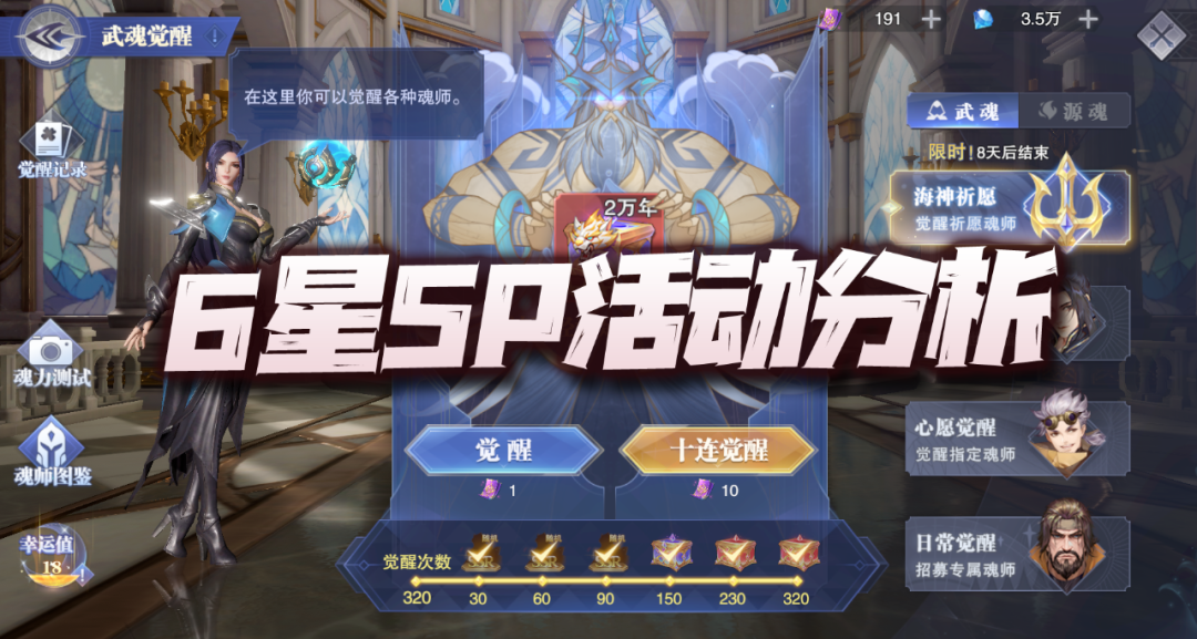 大家好,我是正在打哈欠的何二维一!今天官方又是在游戏中没有任何预告的上线了一次海神祈愿活动,昨天维一都在思考,这次唐晨返场老区居然没有任何的抽取活动,难得官方给了我们一次可以休息的良机,好歹可以慢慢存点武魂觉醒券了,结果这第二天就来个可以抽取6星SP魂骨自选大礼包的海神祈愿活动,当然维一也是毫无疑问的再次300抽保底了,所以今天的活动分析文章多少也会带点怨气!哼!这里我们先简单的分析一下此次活