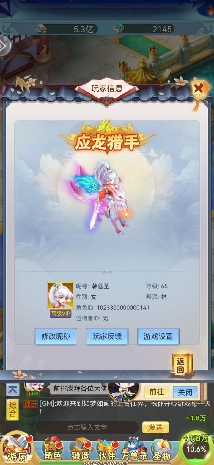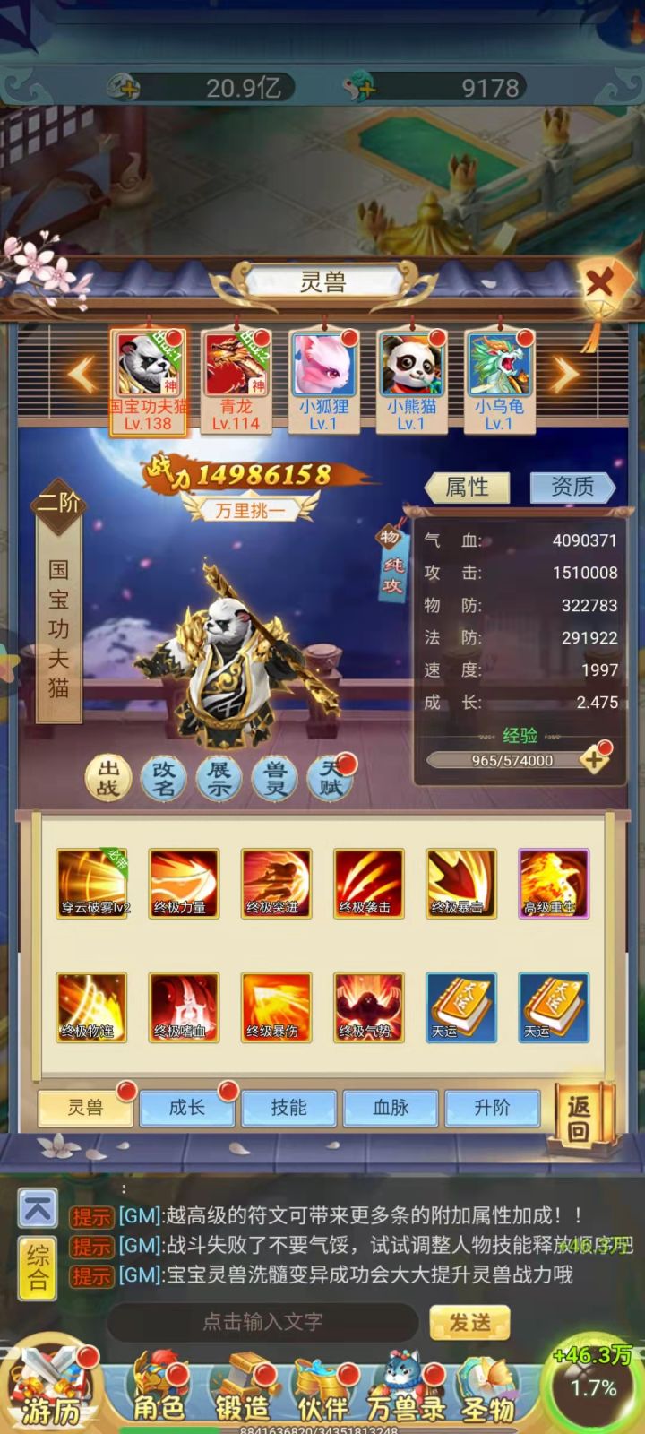 2宠物选择,首充党主熊猫(存着玉,等熊猫),辅助齐天大圣(主要喜欢),梼杌,应龙,凤凰,麒麟自己选择