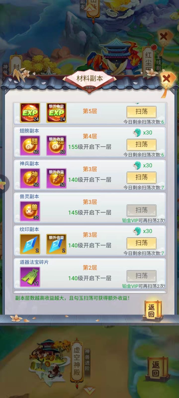 6封魔录(出应龙和洗髓丹),天关(神仙觉醒用品),锁妖塔(珍兽石和升级宠物的)