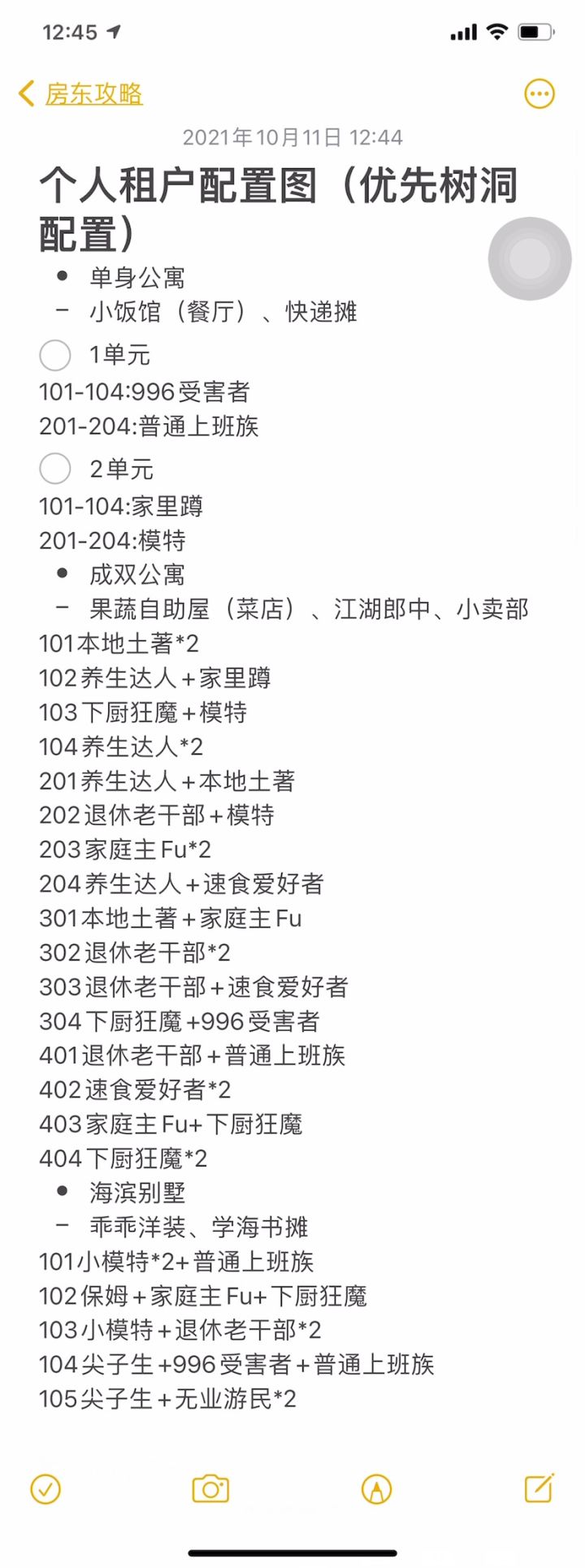 新人攻略3.0木哈哈哈哈,五个树洞齐全,舒服了一个是我的租户配置图,包含摊位设置什么。下面附上租户活动时间轨迹图和房屋建筑设施位置图有不清楚的问题可以看我之前的攻略坐等更新第四期,嘻嘻 感谢:微博—晚风和季、微博—咪咕爱吃鸡蛋的攻略做参考。最新的租户活动时间图 房屋建筑放置图双人公寓的招租方法有不清楚的问题可以看我之前的攻略 感谢:微博—晚风和季、微博—咪咕爱吃鸡蛋的攻略做