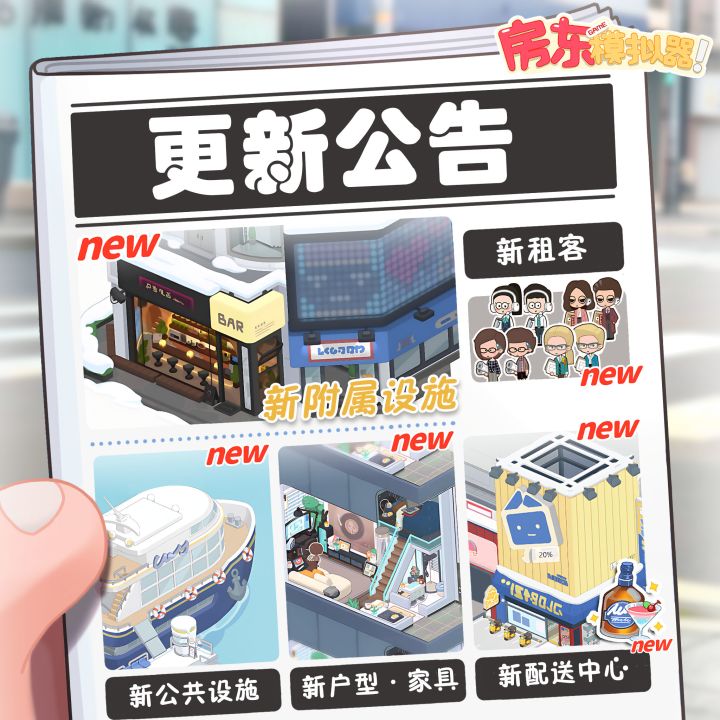亲爱的房东大大们~《房东模拟器》TapTap冬日谷听雪公寓更新来啦!✨更新內容1. 新增公共设施:环城游轮2. 新增附属设施:街角吧3. 新增1个配送中心及订单4. 新增1套全新房间户型及家具5. 新增1套房东的家精选家具6. 新增4名租客及4个树洞7. 新增地标及电车8. 其他功能优化及修复已知问题❗前排提示:为了大大们存档不丢失,请大家通过官方渠道更新。❗各渠道机型的更新