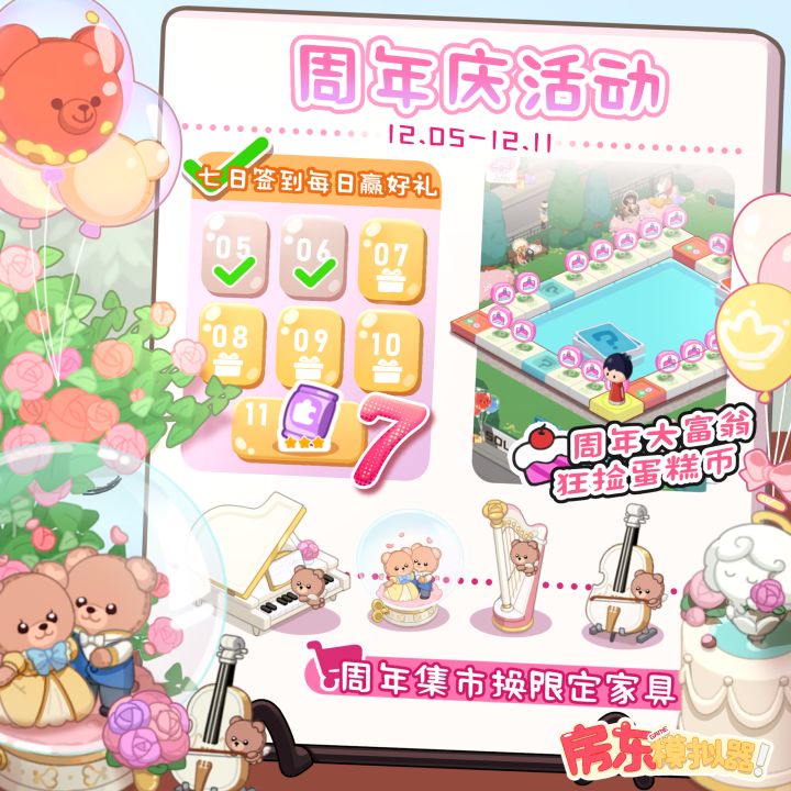 🎂上午好呀亲爱的小房东们!📣好激动好激动!三周年限时活动马上就要开始了!📅12月5日-12月11日期间,来游戏内参与三周年活动吧~🎂活动期间连续七天签到,即可获得绿钞、拼图卡包等签到奖励👏参与周年大富翁活动,不仅可以触发各种有趣事件,还能获得周年货币,前往周年集市兑换三周年限定小熊家具!为了感谢小房东们的陪伴!包租婆还给大家准备了三周年限定周边—