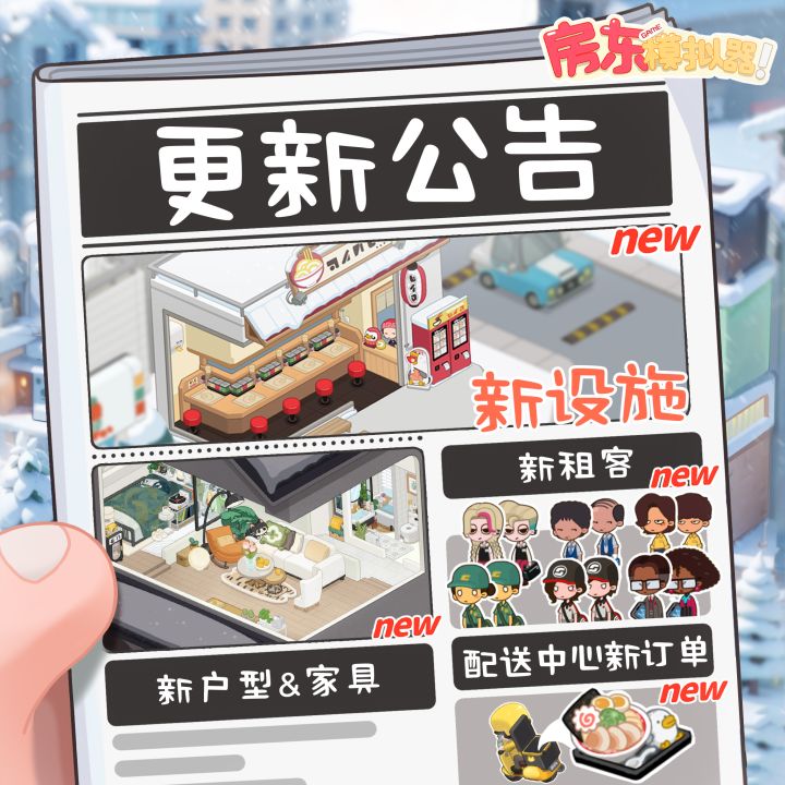 亲爱的房东大大们~《房东模拟器》TapTap最新地图更新来啦!✨更新內容1. 全新雪景地图-冬日谷冬日谷已经开放,白雪皑皑,等你来探索!2. 新增配送中心及外卖玩法接单、采购、配送,成为冬日谷的外卖小能手,为租客们送去温暖!3. 新增场景天气系统准备好迎接风雪交加的挑战了吗?记得随时关注天气预报哦~4. 新增附属设施:小点点奶茶小点点奶茶店开业啦,招牌奶茶暖身又暖心!5. 新增