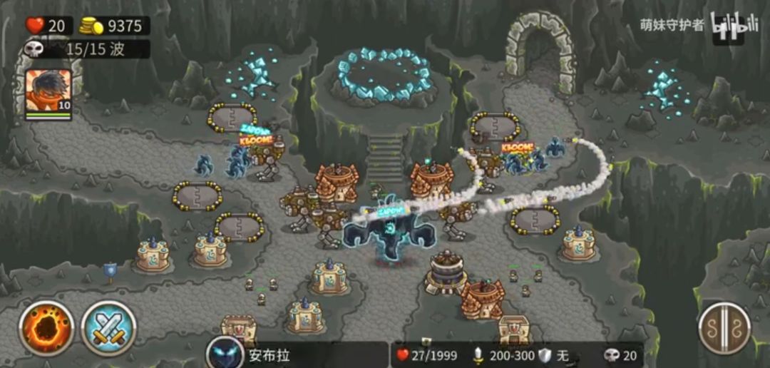 安布拉分裂后只有打掉超过两个碎片才会开始拆塔,而每次打掉碎片有上限,至少第三次可以打到剩下两个碎片,此时为安布拉的最后一条命。综上,前期以高达为主力输出,在BOSS分裂后调走高达不打碎片,重复至少两次后直接一次性打掉8个碎片再用大法疯狂输出即可过关,打完安布拉后金币不但不损失反而还会涨几千