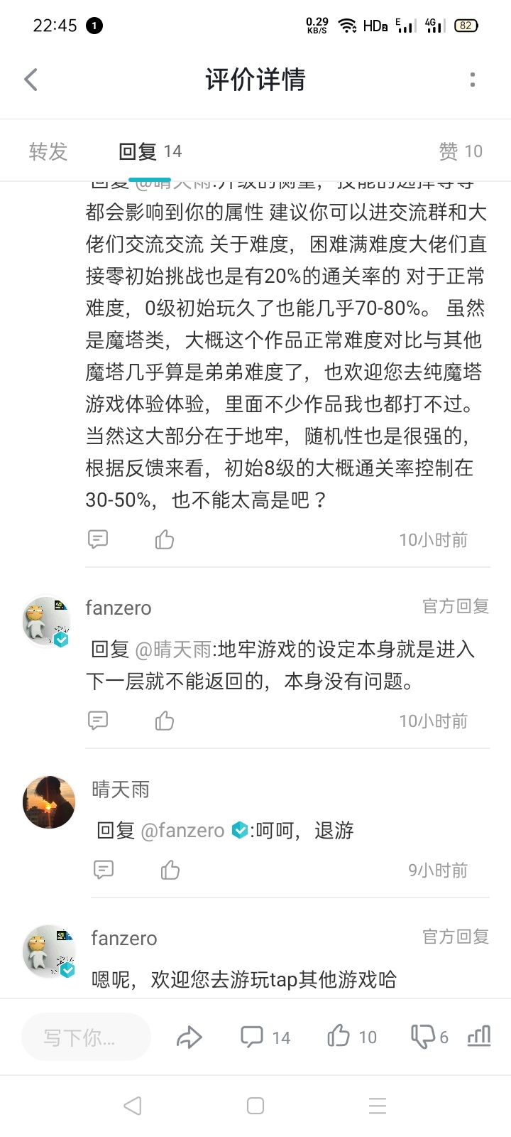 20%的通关率也好意思拿出来说,运气不好等于0%呗,对于玩家提问的问题,作者最终的答复是欢迎你去玩别的游戏,真有意思,早脱坑早解脱,附上截图为证,看看作者的态度,决定了游戏的未来走向,lj游戏