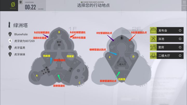 小欧今天也来啦!这次攻略组带来了天狼星的进阶玩法,探员们速来集合学习!一、平面图解构以往大家都会第一时间关注出生点,今天我们标出了档案室和管道的位置哦!从图中可以看出地图上一共有3个档案室和4条主要管道。二、落点技巧通过上面的平面详细图,了解了4个管道连接处后,探员们就可以通过这种方法更有效地互相配合了!【一】1楼A点看向二楼E点窗户走廊,明显有2个下落点,分别对应着E点1号下落点的
