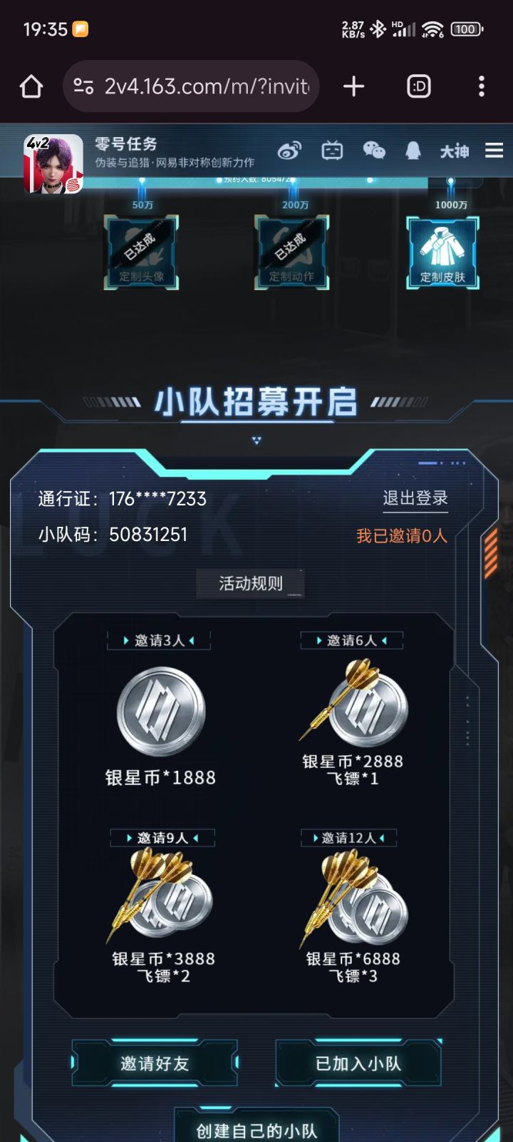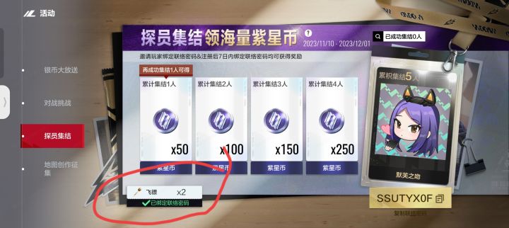 邀请码SSUTYX0F可得2飞镖(可抽奖)点击活动探员集结圈住的飞镖处兑换
