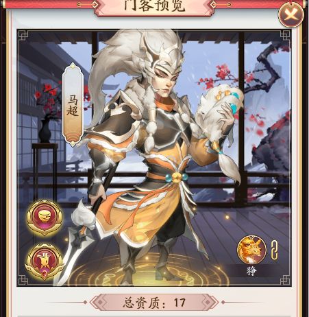本文首发【大东家攻略组】公众号,未经授权禁止“抄袭文章”转载至其它平台。门客资质今天我们来介马超这个门客,三国时期最著名的人物之一,五虎上将之一马超。他的初始总资质是17。接下来我们就一起来看看有那些属性吧资质介绍神威万里和电光金石都是增加驿站赚速的资质,这里的星级倍数是8倍,神威万里是5星资质,派遣驿站的话会额外的增加2倍的赚钱,一共就是10倍的驿站园赚速提升。皮草世家、华冠裘衣和奢华指