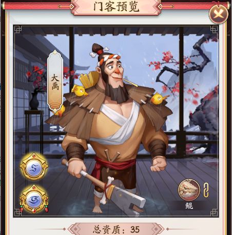 本文首发【大东家攻略组】公众号,未经授权禁止“抄袭文章”转载至其它平台。门客资质今天我们来介大禹这个门客,传说中的一个人物,大禹治水的故事就是讲的他。他的初始总资质是35。接下来我们就一起来看看有那些属性吧。资质介绍粮米之商、开垦荒地、引水灌溉和开渠技法都是增加田庄赚速的资质,这里的星级倍数是18倍,开渠技法是8星资质,派遣田庄的话会额外的增加80倍的赚钱,引水灌溉是6星资质派遣田庄也会增