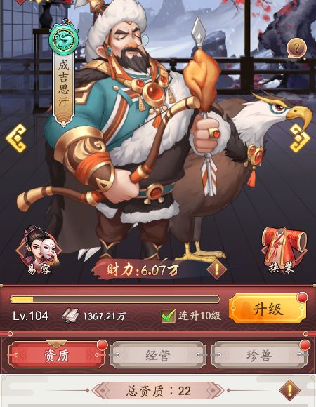 本文首发【大东家攻略组】公众号,未经授权禁止“抄袭文章”转载至其它平台。门客资质今天我们来介绍成吉思汗这个门客,一代天骄成吉思汗。他的初始总资质是22。接下来我们就一起来看看有那些属性吧。资质介绍海运监工和城市整治都是增加码头赚速的资质,这里的星级倍数是8倍,城市整治是5星资质如果派遣码头的话会额外增加2倍的赚速,一个达到10倍的码头委派倍数。皇庄霸主、佃租大亨和率土之滨都是增加田庄赚速