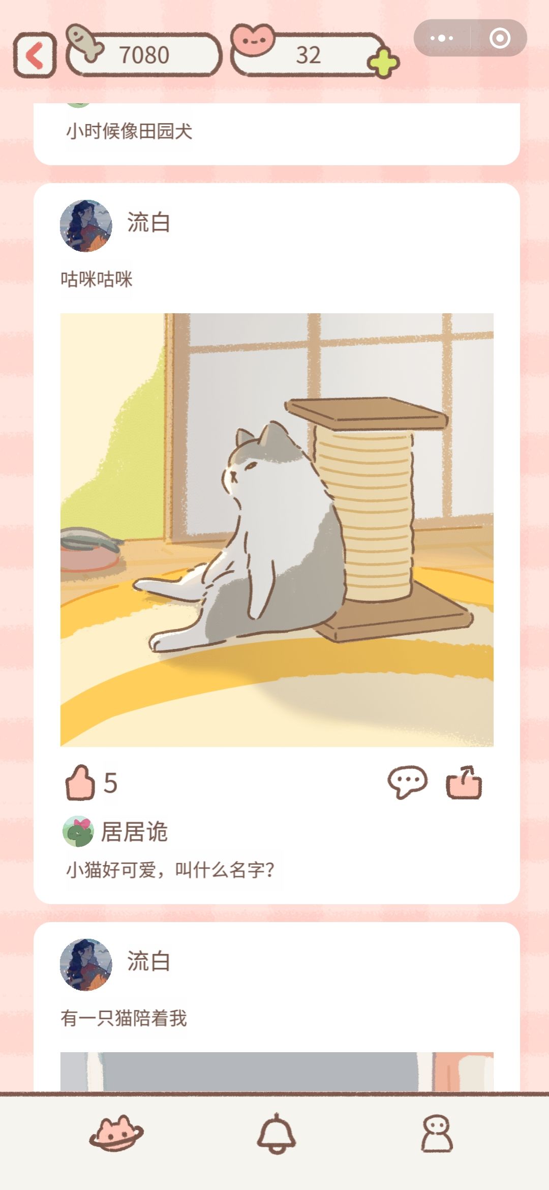 *家具/服饰/食物/特殊收集物品都有可能触发喵圈和聊天框(已列出81项,需要查看请直接往下翻至评论区) *与猫猫互动达到一定好感度也能触发喵圈和聊天框 *衣服最好不要买,喵蛋机里也能抓出衣服,很容易全收集 *收集到一定数量的衣服和特殊收集物后喵蛋机每次只会刷新5,6个左右,如果刷新的喵蛋都是一样小的(一分钟或者两分钟就能打开的喵蛋,里面都是食物类),可以继续刷新,直到看到大喵蛋(大喵蛋里才会有特殊