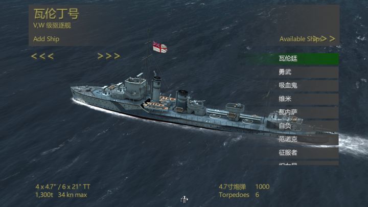 要找到这级战舰非常容易,ⅴ,w级驱逐舰,顾名思义,所有战舰的名字都是用v,w开头的。是游戏中除了护航驱逐舰之外最弱的驱逐舰。以瓦伦丁号为范例。该舰装备四门4.7英寸火炮(前二后二)以及六发鱼雷,可以对轻巡洋舰发动致命雷击。(才六发,J级都有十发了)贫弱的防空火力,说真的,一门37mm火炮,外加两挺机枪是真TNDLJ。拿1936a型驱逐舰来当靶子。使用穿 甲 弹至少要命中12发才能击沉。