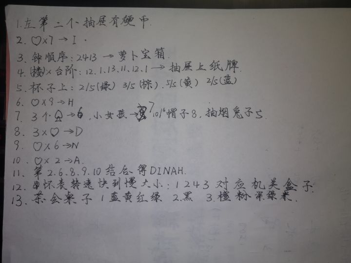 进入游戏后,我们能看到这张图记住这张图,后面要考的。点击拾取硬币,然后投入游戏机,里面是爱丽丝吃蛋糕(大概要吃45块左右),可以分几次吃,不要慌。游戏通关后,可以拿到一把螺丝刀。接着去有巨兔的房间用螺丝刀拧掉楼梯上木条的螺丝,然后记下楼梯上的数字,12,1,13,11,12,1。回到一开始的房间,点击柜子,俩俩换牌,从左到右为:QAKJQA,得到钥匙。观察钟表和座钟钟摆,然后用钥匙打