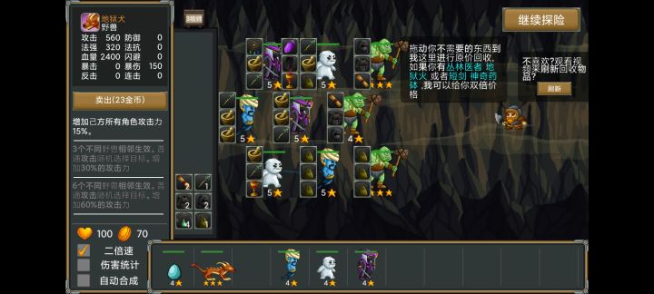 游戏后期无力,装备,流派,阵容,毫无用处!扣一星!完全免费的游戏,看广告必须得支持一下作者,但是,百分80的广告最少都是35秒起步,京东广告居然长达53秒!拍拍贷的广告也长达45秒,游戏广告也43秒!看10次广告最少7次是45秒以上的广告!精英怪、回收站必须得看广告,一局游戏有一半以上时间都被广告占着,广告时长扣三星!一星游戏建议别玩!