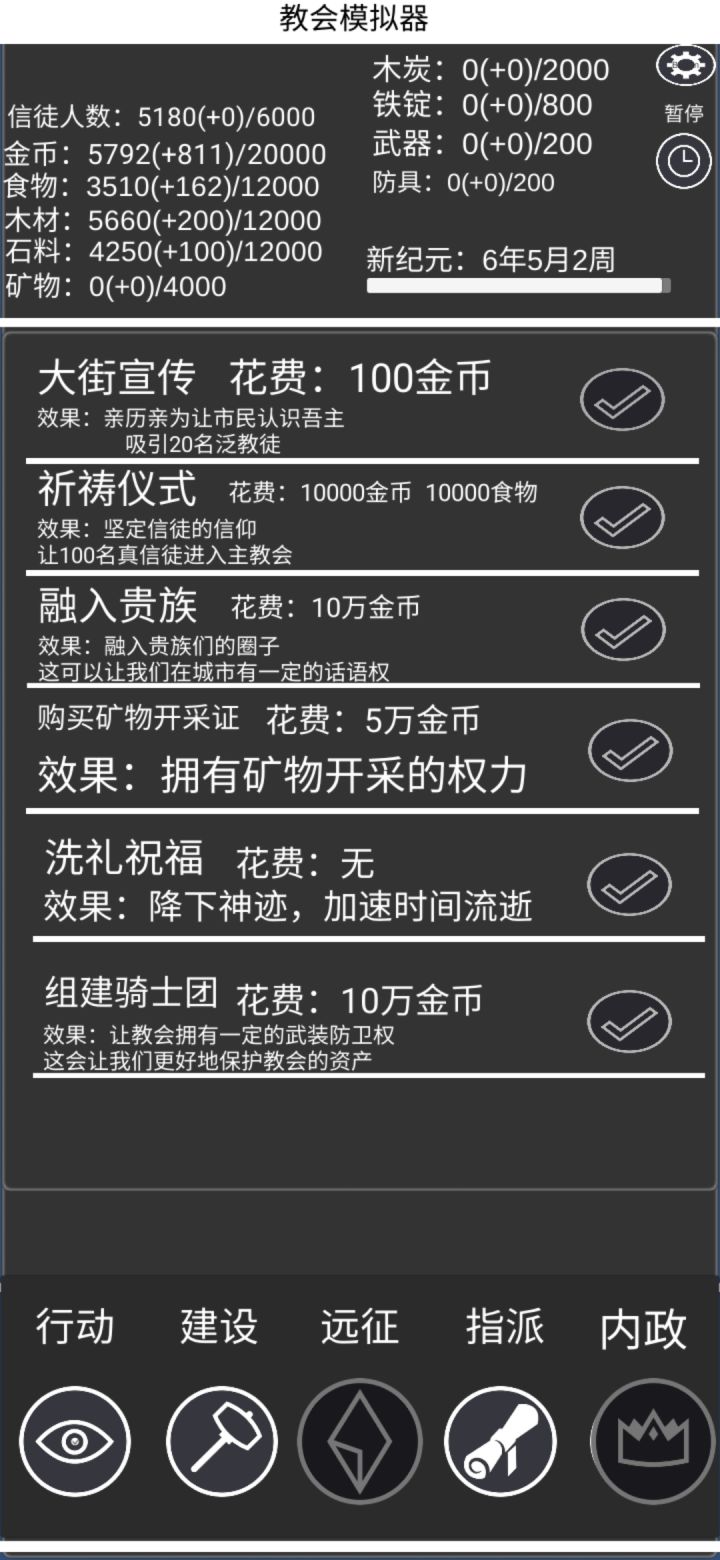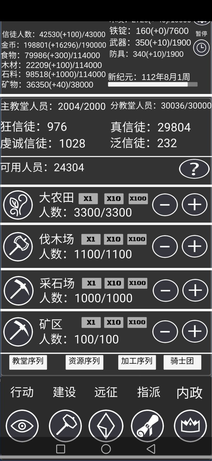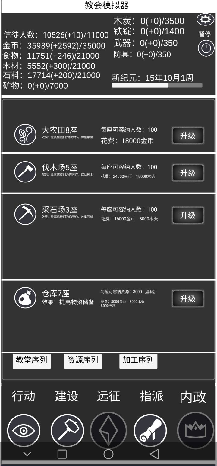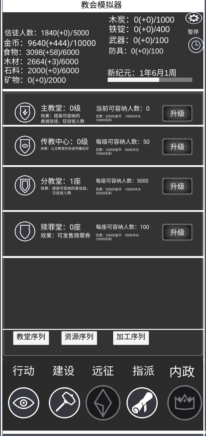 1、点击开始新游戏会闪退答:可以试着点击继续游戏,然后点击右上角的重置正常游玩2、金币只有1w,木头只有6000,造不了建筑答:升级仓库提高容量3、金币不增长了答:看看容量,可能是超容量了,升级仓库4、点击祈祷仪式没反应答:可能是主教堂容量满了,检查下主教堂的空位5、点击宣传无反应答:可能是分教堂容量满了,升级下分教堂6、点击吸引流民没反应答:可能是到达城市人口上限了,要扩建
