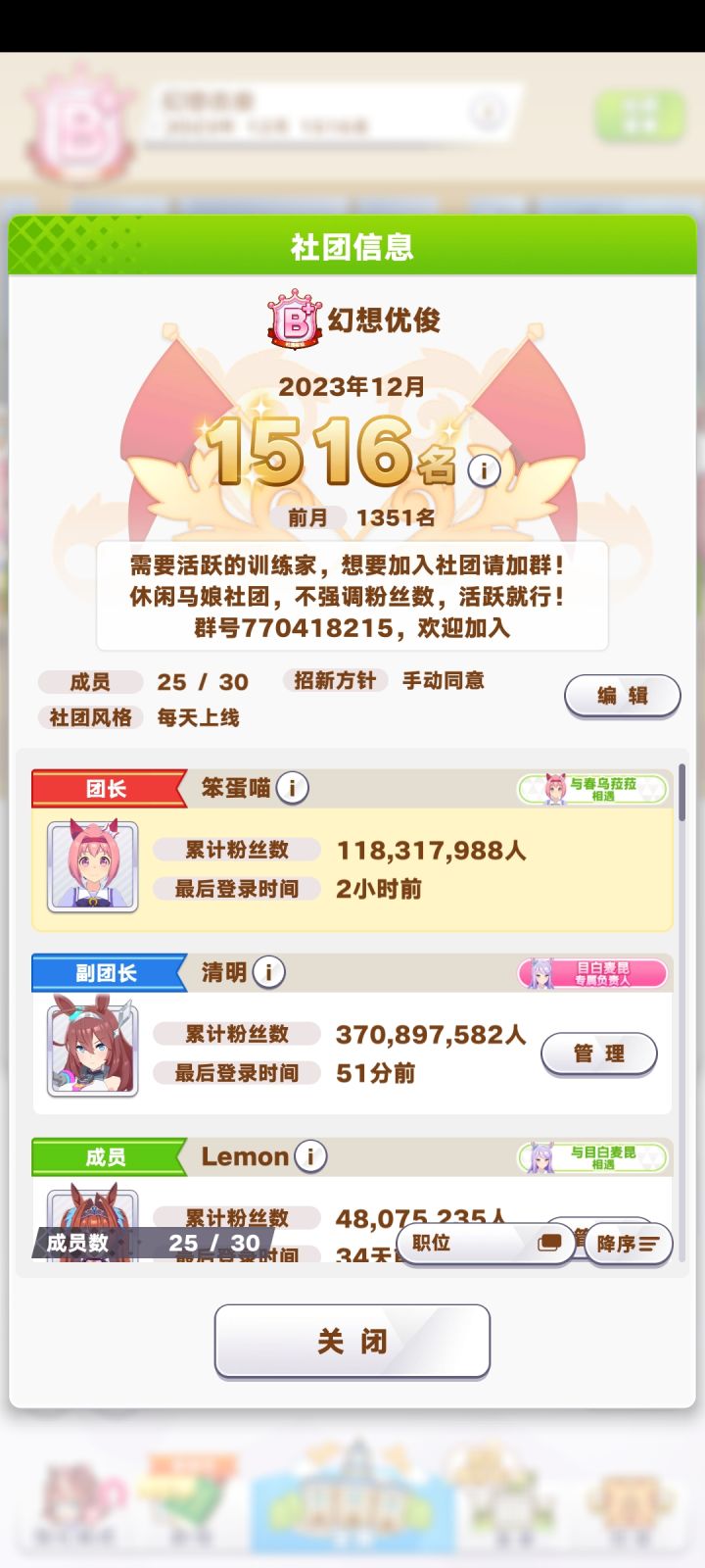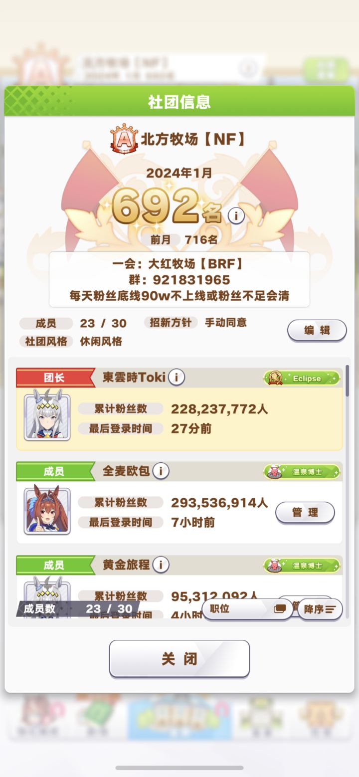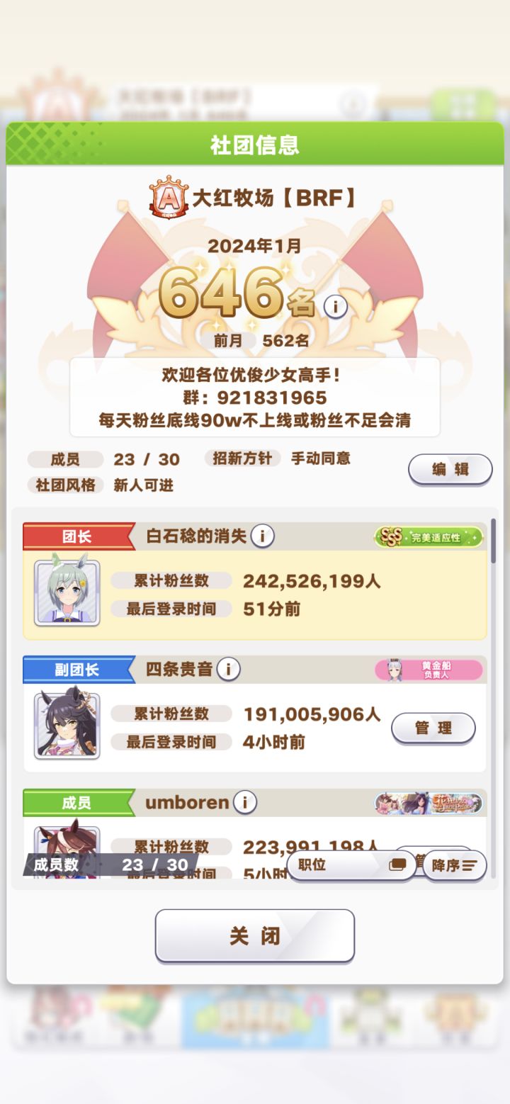 稳A工会 招人啦!新年清了一波僵尸,现在工会一会和二会都有很多位置,日贡90w每周结算平均值,群:921831966 主要是用来发布每周结算数据,群里也会交流凹马和卷大赛的(失败)心得,不想水群潜水也完全没问题,欢迎大家来玩!