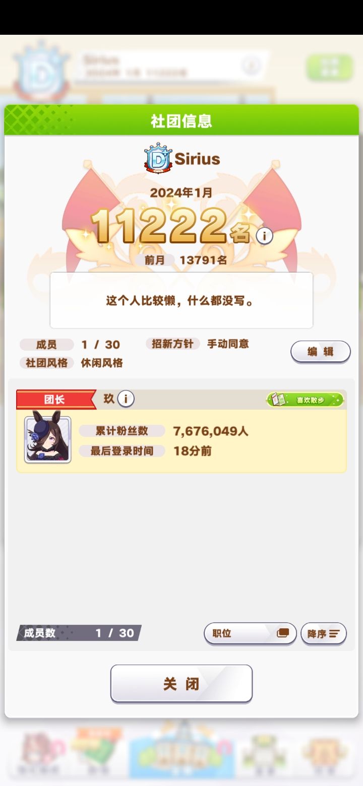 我也是个新人,之前闲着没事,建了个社团,结果很久都没有人进,试着来招两个人,看能不能一起聊聊天,本社团比较闲,有喜欢交朋友的训练员可以来